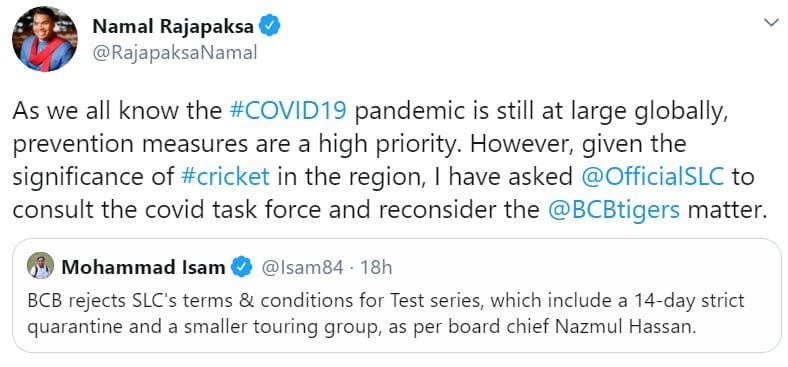 Sri Lanka’s sports minister Namal Rajapaksa took to Twitter to explain his stand and said, “As we all know the COVID19 pandemic is still at large globally, prevention measures are a high priority. However, given the significance of #cricket in the region, I have asked OfficialSLC to consult the Covid task force and reconsider the BCBtigers matter”, he said.
