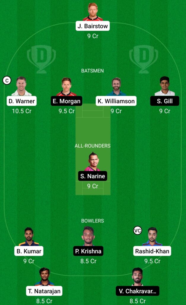 Kolkata Knight Riders: 1. Shubman Gill, 2. Nitish Rana, 3. Rahul Tripathi, 4. Eoin Morgan (c), 5. Dinesh Karthik (wk), 6. Andre Russell, 7. Sunil Narine/Lockie Ferguson, 8. Shivam Mavi/ Kamlesh Nagarkoti, 9. Pat Cummins, 10. Varun Chakravarthy, 11. Harbhajan Singh