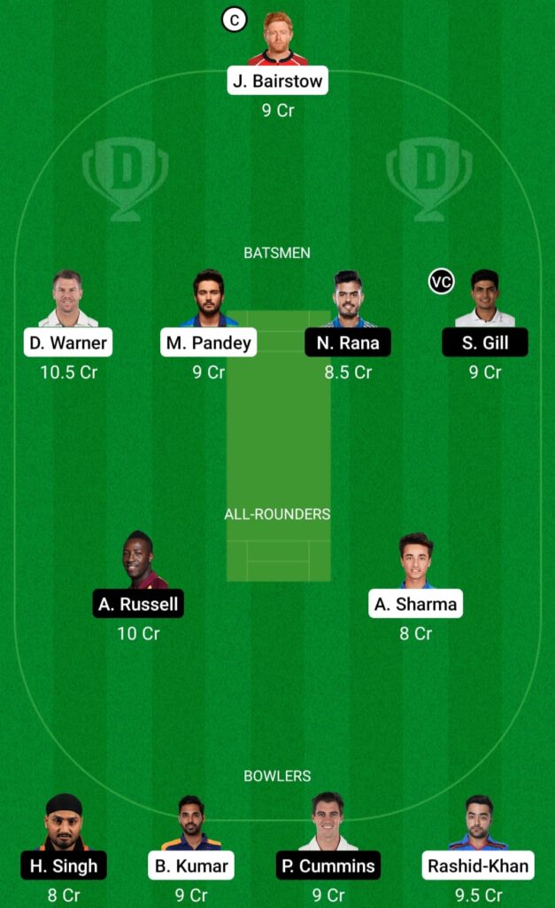 Sunrisers Hyderabad: 1. David Warner (c), 2. Jonny Bairstow, 3. Manish Pandey, 4. Kane Williamson, 5. Priyam Garg, 6. Abdul Samad, 7. Abhishek Sharma, 8. Rashid Khan, 9. Bhuvneshwar Kumar, 10. Sandeep Sharma, 11. T Natarajan
