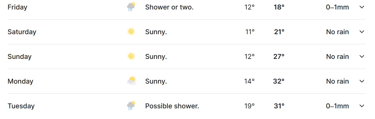 According to BOM, there is a possible shower or two on Friday (day one), but only a 25% chance of up to 1mm. The weather will warm up on days two, three and four, with temperatures of 21 degrees, 27 degrees and 32 degrees respectively. No rain is expected on any of those three days.