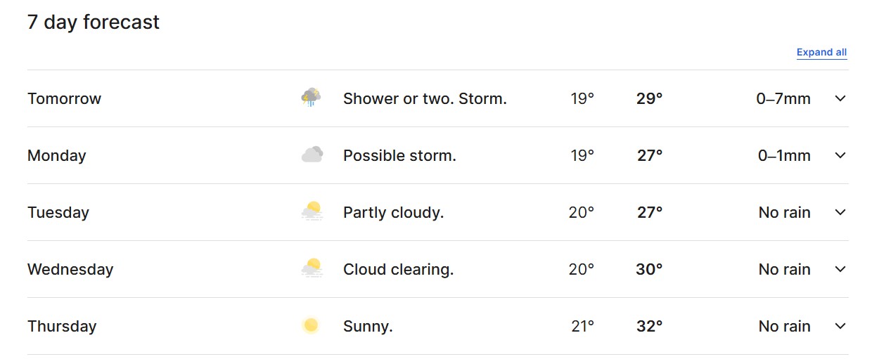 The Bureau of Meteorology (BOM) forecasts a “shower or two” with “a thunderstorm likely” with a top of 29 degrees on Sunday (day one). According to the platform, there is a 50% chance of at least 2mm and 25% chance of at least 7mm.