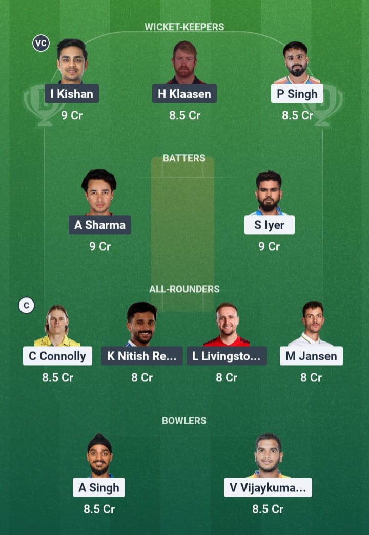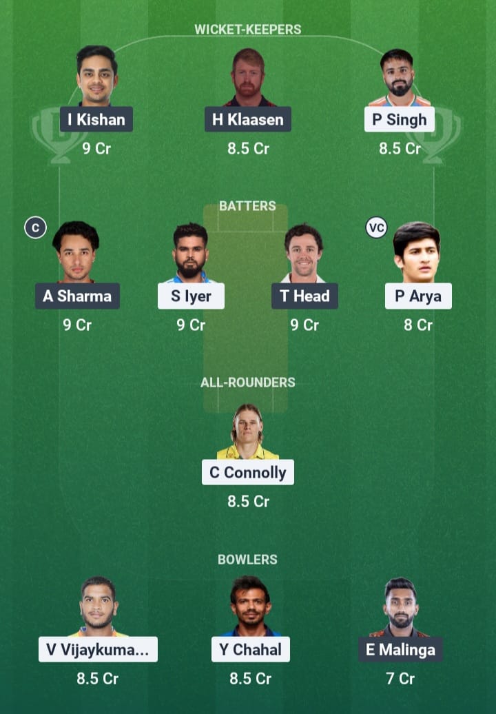 Sunrisers Hyderabad: 1. Travis Head, 2. Abhishek Sharma, 3. Ishan Kishan (c & wk), 4. Heinrich Klaasen, 5. Aniket Varma, 6. Liam Livingstone/Salil Arora, 7. Nitish Kumar Reddy, 8. Shivang Kumar, 9. Harsh Dubey, 10. Harshal Patel, 11. Praful Hinge/Jaydev Unadkat