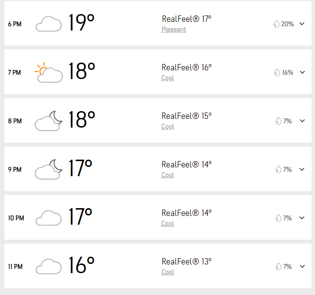 AccuWeather hourly forecast for evening of Sunday 23 October 2022