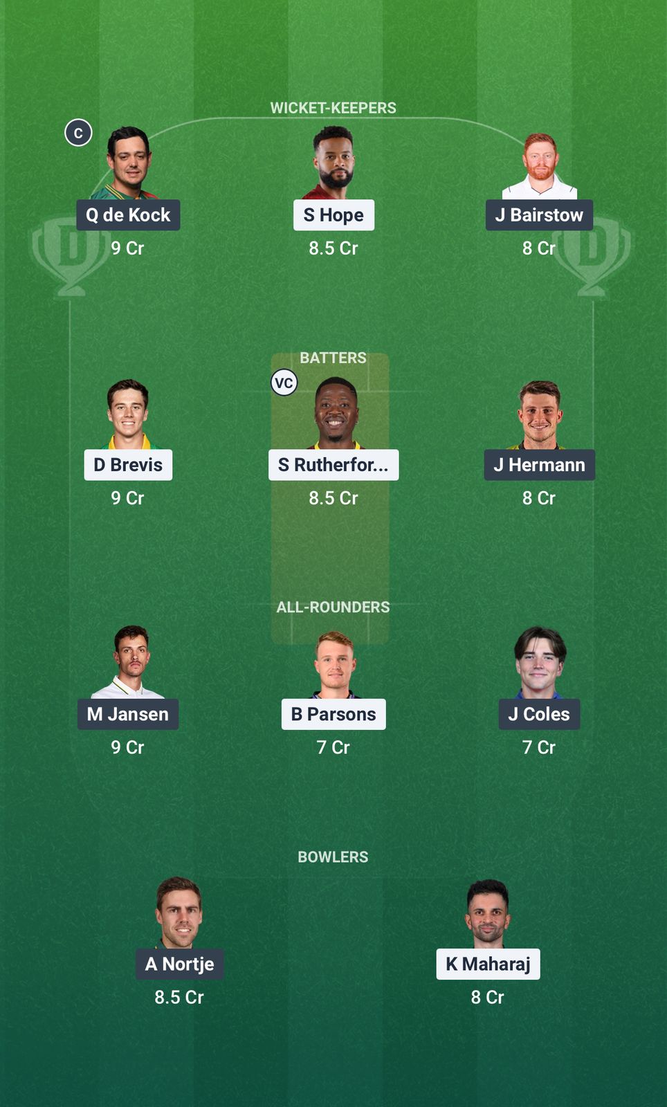 Sunrisers Eastern Cape: 1. Quinton de Kock (wk), 2. Jonny Bairstow, 3. Matthew Breetzke, 4. Jordan Hermann, 5. James Coles, 6. Tristan Stubbs (c), 7. Marco Jansen, 8. Chris Green, 9. Senuran Muthusamy, 10. Anrich Nortje, 11. Lutho Sipamla